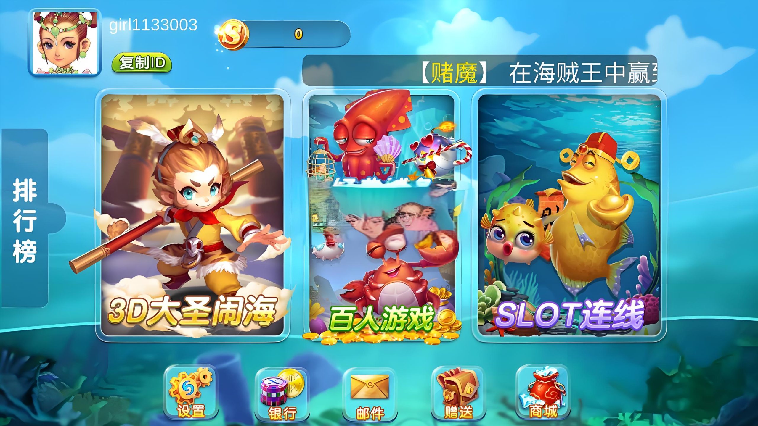 游戏内容:极速捕鱼,21点,百人牛牛,百家乐,经典777,财神来了,三国演义,僵尸新娘,9线拉王,海贼王,超级玛丽
