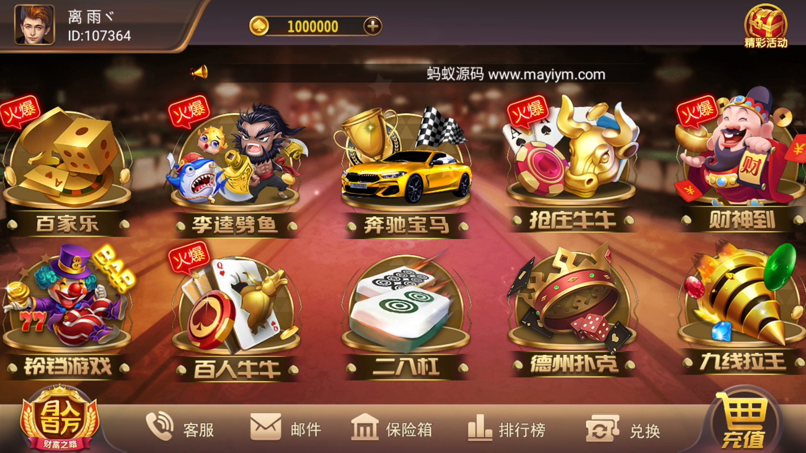 内含游戏:炸金花、飞禽走兽、斗地主、红黑大战、龙虎斗、金蟾捕鱼、百家乐、李逵劈鱼、奔驰宝马、抢庄牛牛、财神到、铃铛游戏、百人牛牛、二八杠、德州扑克、九线拉霸