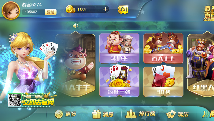 游戏:八人牛牛、斗地主、狂三张、百人牛牛、30秒、红黑大战、龙虎斗、百人骰宝、、百人德州、牌九、百人二八杠、港式五张、三公、推筒子、十三水