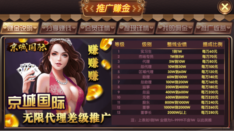 京城国际游戏带有非常棒的推广系统 推广赚金币、佣金提现、推广收益等一目了然