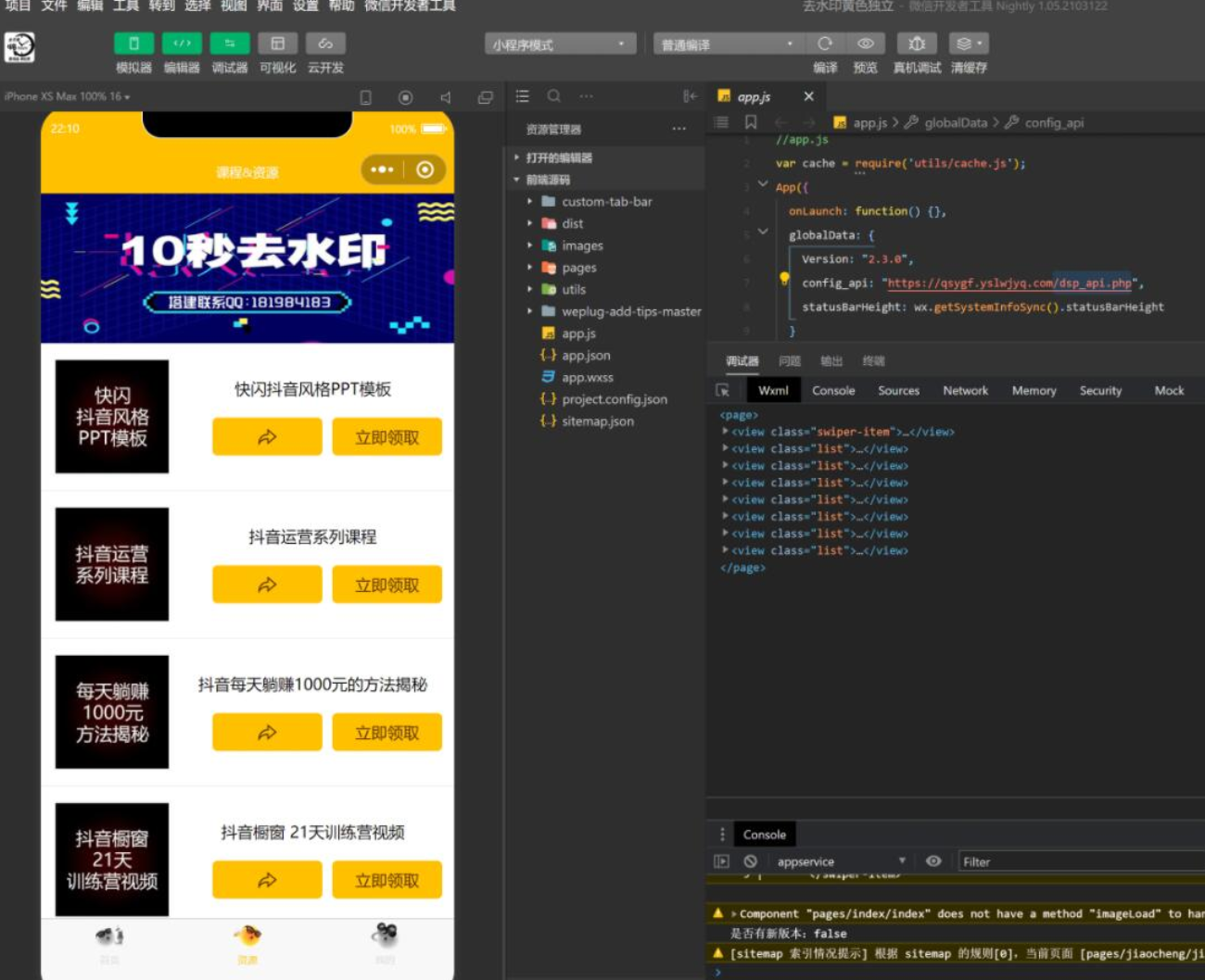详情介绍 热水印小程序的源代码,无论是微信还是QQ小程序都可以使用! 资源下载下载价格20 积分VIP免费升级VIP立即购买此资源购买后1天内可下载。虚拟资源具有可复制性,购买后不支持任何理由退款,请谨慎下单! 请勿商业运营,违法使用和传播!仅供研究学习使用! 原文链接:https://ym.91zyw.com/3585.html,转载请注明出处。 0